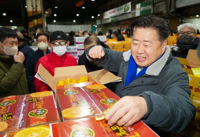 오영훈 지사는 이날 새벽 2시 농협중앙회 제주지역본부를 비롯해 감귤 주산지 농협조합장, 농업인단체, 전국과실중도매인연합회 등과 함께 가락시장 내 법인별 경매현장을 방문했다.