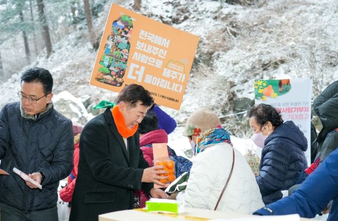 제주도는 방문객이 가장 많이 오가는 구인사 주차장 인근 정류장에 제주 고향사랑기부제 홍보 부스를 설치하고 제주감귤과 함께 고향사랑기부제 팸플릿을 전달하며 ‘마음의 고향 제주’를 알렸다.