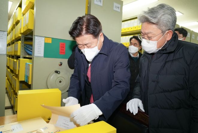 역대 도지사로서는 최초로 지하문서고를 방문한 오영훈 지사는 강철남 제주도의회 행정자치위원장과 함께 보존시설과 기록물을 살펴보며, 기록물관리에 대한 인프라를 확인했다.