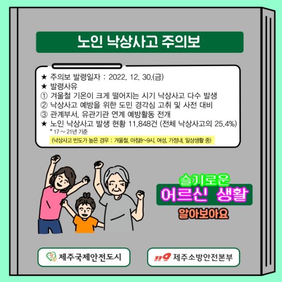 [제주교통복지신문 김현석 기자] 제주특별자치도 소방안전본부(본부장 박근오)는 최근 제주에 대설로 많은 눈이 내리는 등 겨울철 추위가 본격화됨에 따라 30일 '겨울철 노인 낙상사고 주의보'를 발령한다고 밝혔다.