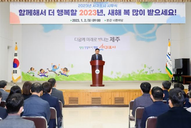 [제주교통복지신문 김현석 기자] 서귀포시는 2일 제1청사 본관 너른마당에서 직원 200여 명이 참석한 가운데 전 공직자가 일심동체하여'청정 건강도시, 행복 서귀포시'를 만드는데 역량을 집중하자는 포부를 다지며 2023년 계묘년 시무식을 개최했다.