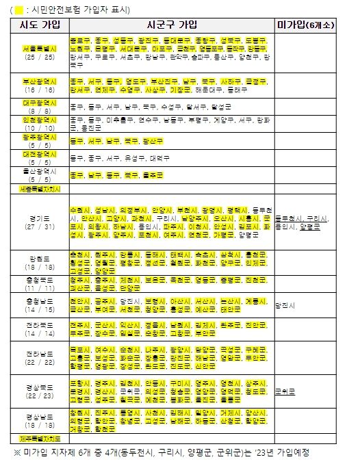 올해 1월 이후 시민안전보험을 신규 계약하는 지자체는 사회재난 사망 특약을 포함하여 가입할 수 있으며, 계약기간이 만료되지 않은 지자체는 만료일 기간까지 사회재난 사망 특약 추가 가입이 가능하다.