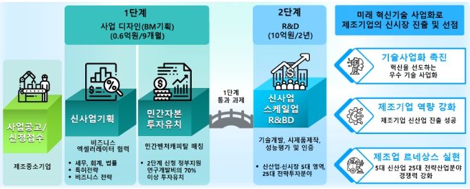 스케일업 기술사업화 프로그램은 1단계로 기업과 엑셀러레이터가 함께 비즈니스 모델(BM)의 완성도를 높이도록 지원하고 IR을 통해 벤처캐피털 투자가 결정되면, 2단계 평가를 거쳐 2년간 과제당 10억원의 R&D 자금을 지원하는 민간투자 연계형 R&D 사업이다.