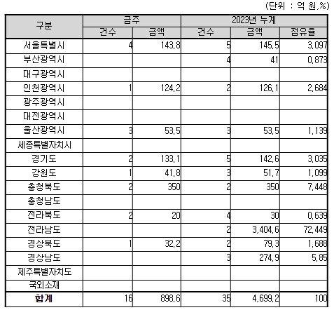 이번 주 집행예정인 16건 중 14건은 지역제한 입찰 또는 지역의무 공동도급 대상공사로, 393억 원 상당(44%)을 지역업체가 수주할 수 있을 것으로 예상된다.