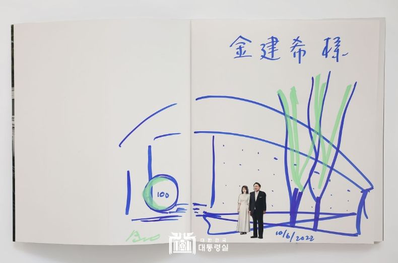 아울러 윤 대통령의 취임식을 축하하며 안도 다다오가 김 여사에게 보낸 ‘푸른 사과’ 오브제와 최근 그의 프로젝트를 설명한 ‘책자’, 그리고 ‘윤석열 대통령 부부를 오브제로 손수 그린 스케치’, ‘2016년 김 여사와 협업하며 함께 찍은 사진’ 등에 대해 감사를 표했다.