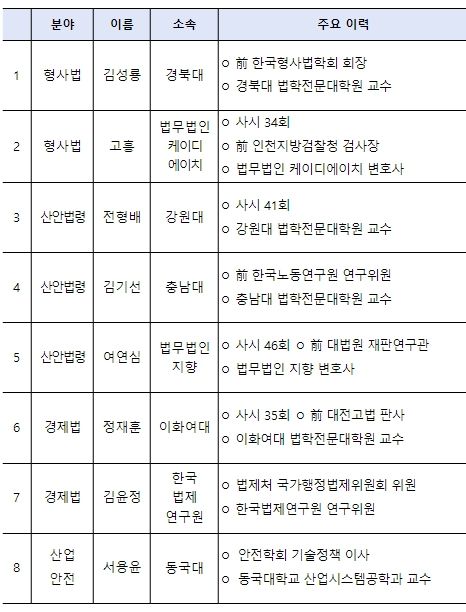 「중대재해처벌법령 개선 TF」는 논의주제의 특성 등을 고려해 학계를 중심으로 총 8명으로 구성했으며, 산업안전법령(중대재해처벌법, 산업안전보건법), 형사법, 경제법, 산업안전보건 분야의 전문가를 균형 있게 위촉했다.