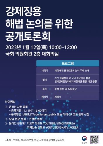 공개 토론회에서는 서민정 외교부 아태국장이 민관협의회 논의 내용을 포함한 국내 의견 수렴 결과 및 이를 바탕으로 진행된 대일 협의 경과를 설명하고, 심규선 일제강제동원피해자재단 이사장이 재단 관련 사항에 대해 설명할 예정이다.