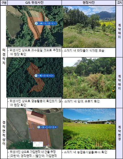 (점검결과 및 조치사항) 점검반은 이번 합동점검을 통해, 임야 등 미경작지 또는 경작면적 상이 등 부정확한 보험인수 사례※(1,091건)를 확인하고, 인수 관련 증빙서류 누락 등 경미한 사항에 대해서는 현지시정 완료했다.