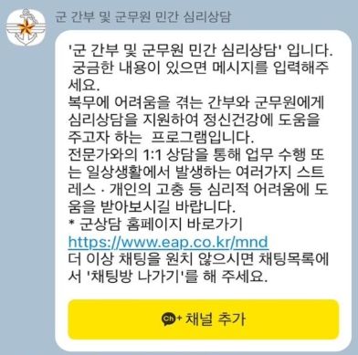 민간 심리상담 프로그램 이용을 희망하는 군 간부 및 군무원은 카카오톡에서 ‘군상담’ 검색 후 ‘군 간부 및 군무원 민간 심리상담’ 채널을 추가하면 홈페이지 안내 및 상담원 채팅 등을 통해 편리하게 이용 가능하다.
