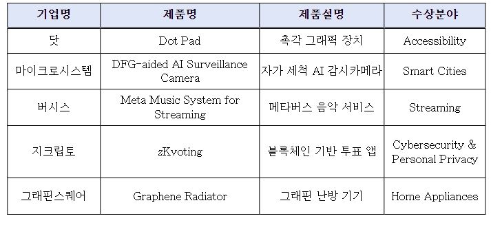 제품 수 기준으로 한국 제품은 개최국인 미국보다 많은 12개(52%)이며, 기업 수 기준으로는 20개사 중 9개사(45%)가 최고 혁신상을 수상하는 쾌거를 이뤘다.