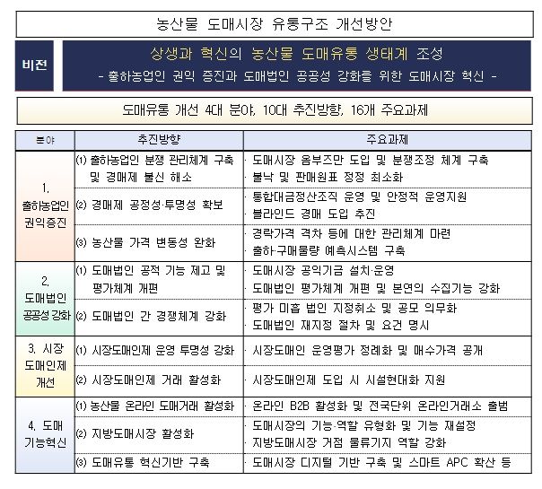 이에 농식품부는 그간 도매유통 구조개선에 대한 농업인과 소비자들의 요구와 전문가·유통주체 의견수렴 등*을 토대로 ❶출하 농업인의 권익증진, ❷도매법인의 공공성 강화, ❸시장도매인제 평가·개선, ❹도매시장 기능혁신의 4대 분야를 지정하고 10대 추진방향과 16개 주요과제를 선정했다.