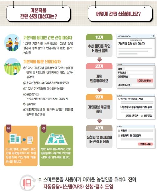 특히 작년 비대면 신청은 스마트폰, 피시(PC)를 활용하여 신청했으나, 농업인이 직불금을 좀 더 편리하게 신청할 수 있도록 올해에는 전화자동응답시스템(ARS) 신청방식을 추가로 도입하여 활용할 예정이다.