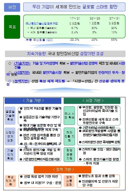신성장 4.0 전략에 포함된 이번 전략은 우리 기업이 세계에 만드는 글로벌 스마트항만을 비전으로, 2031년까지 국내 점유율 90%, 세계점유율 10% 달성을 통해 향후 5년간(‘22~’26) 우리나라 항만기술산업 규모를 2배(1.2조원), 그 이후 5년간(‘27~’31)은 8배(3.9조원)로 확대시키는 것을 목표로 하고 있다.