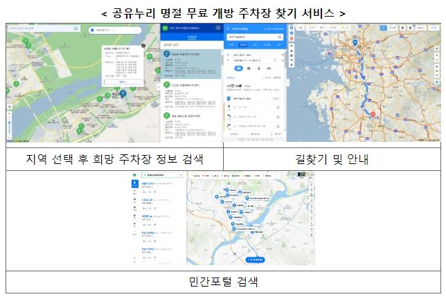 설 무료 개방 공공주차장 정보는 국민 이용편의를 위해 ‘공유누리’뿐 아니라 민간포털 ‘네이버’, ‘다음’에서도 안내되고, 국민이 다양하게 활용할 수 있도록 ‘공공데이터포털’을 통해 파일데이터 형태로 민간에 개방될 예정이다.