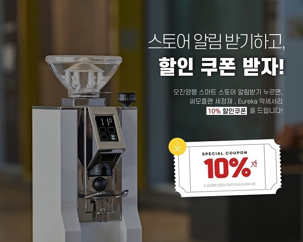 오진양행은 스마트스토어 알림받기를 설정한 모든 고객에게 소모품 10% 할인 쿠폰을 진행하고 유레카 그라인더 액세서리와 써모플랜 세척 알약 등 소모품 카테고리 전 상품에 사용이 가능하다.
