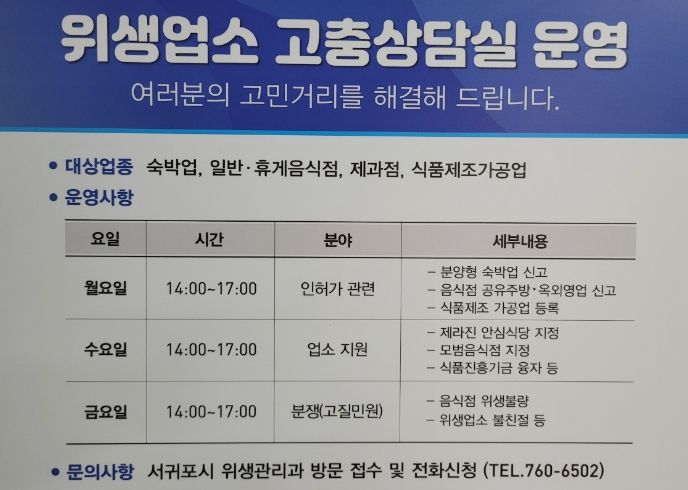 [제주교통복지신문 김현석 기자] 서귀포시는 경제적 어려움을 겪고 있는 위생 영업주와 인허가 민원인 등의 고충해소를 위해 2월 1일부터 12월까지 별관 3층 다목적실에서 고충상담실을 운영한다.