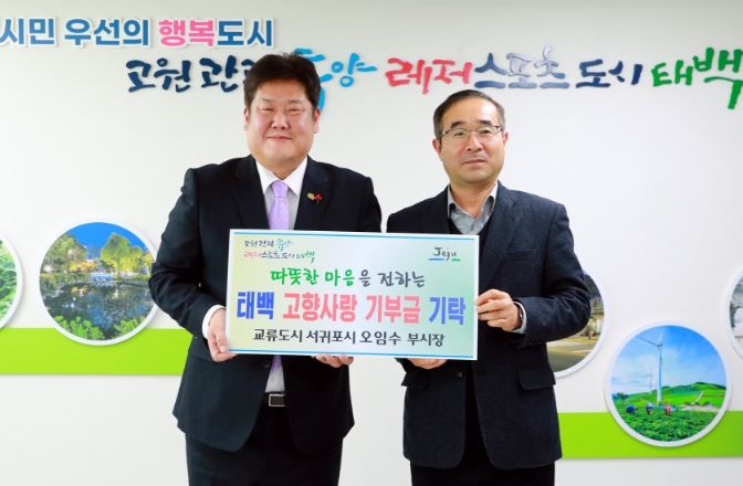 오임수 부시장은“서귀포시와 우호도시인 태백시를 고향처럼 생각하는 마음으로 기부를 결심하게 됐다”며“누구나 부담없는 금액으로 고향 사랑을 실천하고 답례품과 세금공제 혜택까지 누리는 고향사랑기부제 시행으로 건전한 기부 문화가 정착되기를 바란다”고 밝혔다.