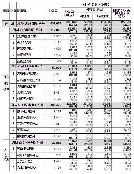 이 밖에 전기공사기사, 기계정비산업기사, 기계설계산업기사, 웹디자인기능사, 화학분석기능사, 사회조사분석사2급 자격은 합격자의 90% 이상이 청년이다.