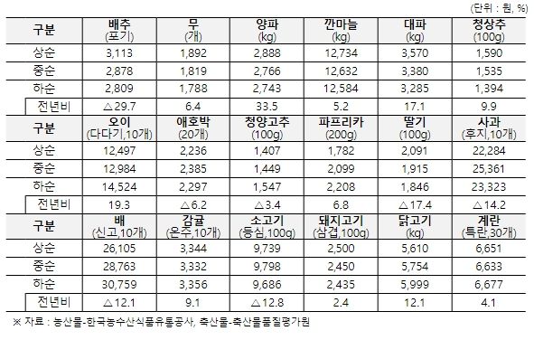 [제주교통복지신문 송한신 기자] 농림축산식품부는 설 명절 이후 농축산물 가격은 생산이 감소한 양파 및 최근 한파 영향으로 출하량이 감소한 오이 등 일부 채소류를 중심으로 다소 높게 형성되고 있으나, 주요 농축산물(18개 품목)의 1월 하순 소비자가격은 전년 대비 1.9% 낮은 수준이라고 밝혔다.