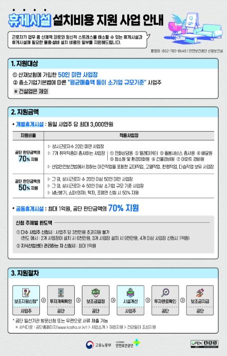 이번 휴게시설 설치비용 지원사업은 지난해 8월 18일부터 모든 사업장에 휴게시설 설치가 의무화됨(산업안전보건법 제128조의2 시행)에 따라 올해 신설됐다.
