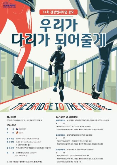 [제주교통복지신문 송한신 기자] 문화체육관광부는 한국관광공사(사장 김장실)와 함께 2월 1일부터 3월 3일까지 ‘제14회 관광벤처사업 공모전’을 열고 창의적이고 혁신적인 사업 아이디어를 지닌 관광 분야의 예비창업자와 창업기업 140곳을 발굴해 지원한다.