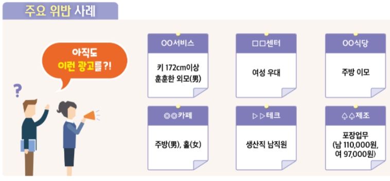 ‘키 172㎝ 이상 훈훈한 외모의 남성’, ‘주방 이모’라는 표현을 쓰면서 직무 수행에 필요하지 아니한 용모·키 등의 신체적 조건을 요구하거나, 직종의 명칭에 특정 성만을 지목하는 경우도 있었다.