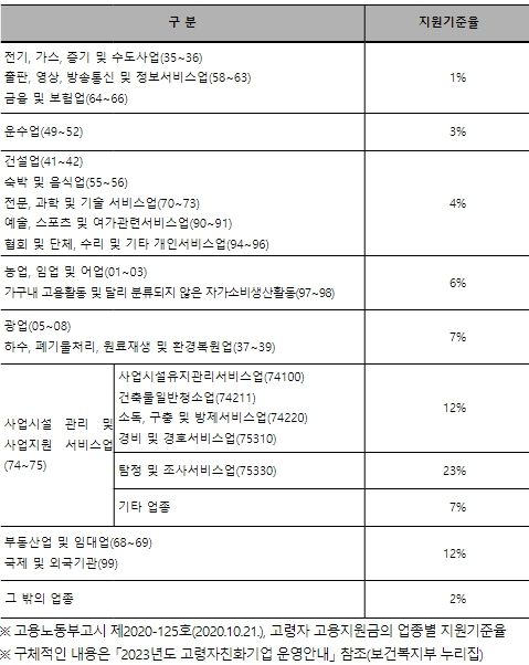 구체적으로, 공모 접수일 기준 업종별 고령자 기준 고용률을 충족(최소 5명 고용 필수)하면서 사업운영 기간이 1년 이상, 전년도 매출액이 3억 원 이상, 전년도 근로자가 5명 이상인 기업이 5명 이상의 고령자를 신규로 채용하고자 하는 경우 사업 신청이 가능하다.