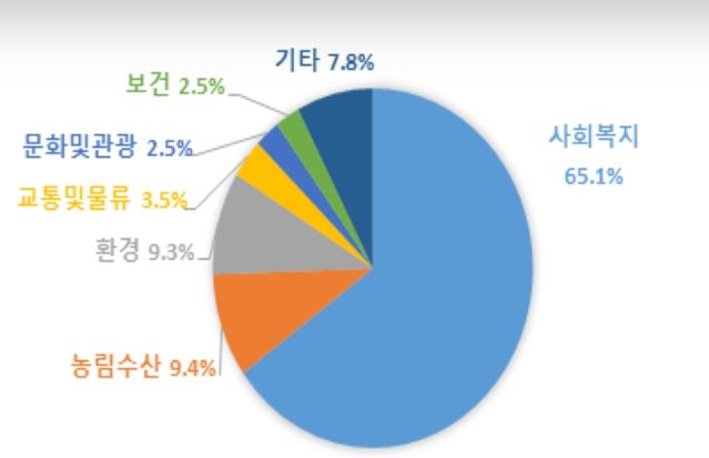 특히, 올해는 국정기조에 맞춰 사회적 약자를 지원하기 위한 예산이 크게 반영되어 다른 분야에 비해 사회복지 분야가 전년도 대비 9.4조원의 큰 폭으로 증가했다.