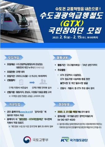 [제주교통복지신문 송한신 기자] 국토교통부는 내년 개통을 앞두고 있는 수도권광역급행철도(GTX-A) 사업에 대한 국민의 의견을 듣고, 이를 사업에 반영하기 위해 ‘GTX 국민참여단(이하 “참여단”)’을 모집·운영한다고 밝혔다.