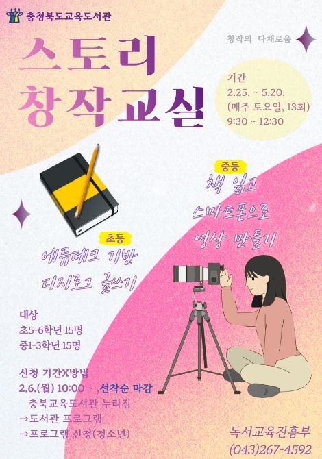 [제주교통복지신문 김강석 기자] 충청북도교육도서관은 2월 6일(월)부터 13일(월)까지 도서관 누리집을 통해 스토리창작교실 참가자를 모집한다.