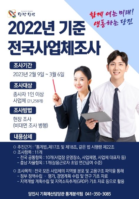 [제주교통복지신문 김강석 기자] 당진시가 2월 9일부터 3월 6일까지 당진시 관내 산업활동을 수행하고 있는 사업체 21,258개에 대해‘전국사업체조사’를 실시한다.