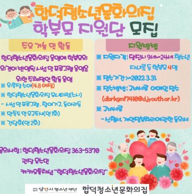[제주교통복지신문 김강석 기자] 합덕청소년문화의집에서는 오는 3월 31일까지 당진시 거주 청소년(9세~24세) 자녀를 둔 학부모 4명을 대상으로 학부모 지원단을 모집 할 예정이다.