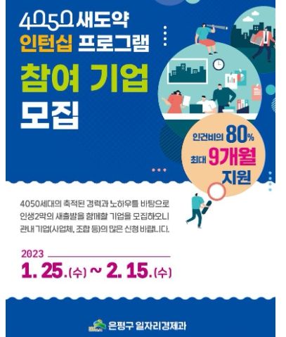 [제주교통복지신문 김강석 기자] 서울 은평구가 늘어나는 40~50대 조기 퇴직·은퇴자들의 재취업을 돕기 위한 ‘4050 새도약 인턴십 프로그램’을 추진한다고 밝혔다.