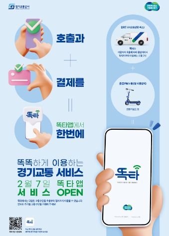 경기도와 경기교통공사는 7일 수요응답형 버스(DRT), 공유 개인형 이동장치(PM) 등 교통수단의 호출은 물론 예약과 결제를 애플리케이션(앱) 하나로 해결하는 통합교통플랫폼 ‘똑타’를 출시한다고 6일 밝혔다.