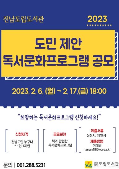 [제주교통복지신문 김강석 기자] 전라남도립도서관은 도민이 직접 도서관 프로그램 기획에 참여하는 ‘2023 도민 제안 독서문화프로그램’을 공모하는 등 도민 참여 분위기 확산에 나섰다.