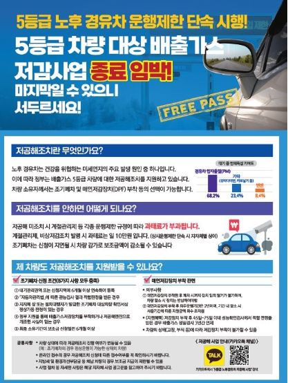 한편, 환경부는 배출가스 5등급 경유차에 대해 올해까지만 저공해 조치(조기폐차, 매연저감장치 부착)를 지원할 계획이다.