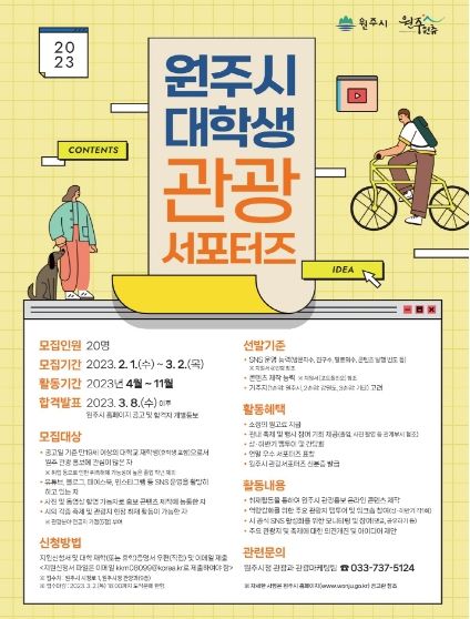 [제주교통복지신문 김강석 기자] 원주시가 2023년 원주지역 관광자원 홍보에 참여할 대학생 관광서포터즈를 모집한다.