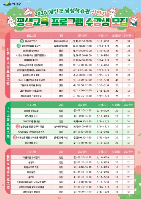 [제주교통복지신문 김강석 기자] 예산군평생학습관은 이달 8일부터 24일까지 상반기 평생학습관 프로그램 수강생을 모집한다.