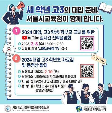 아울러 서울시교육청에서는 교사용'2024 대입, 학년 초 진학지도 동영상(6편)'및 '2024 대입, 고3 학년초 진학지도 자료집(1종)'을 서울 소재 고등학교의 신학년 집중 준비기간과 학부모 총회 등에 활용할 수 있도록 2월 초까지 보급한다. 관련된 파일은 서울진로진학정보센터 누리집에'에 2월 10일까지 탑재하여 교사뿐만 아니라 수험생과 학부모도 활용 가능하도록 제공한다.