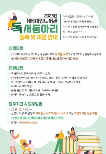 거제시 평생교육과장은 “독서동아리 활성화 사업을 계기로 관내 독서 인구 저변 확대와 건강한 독서 토론 문화를 조성해 나갈 수 있기를 기대한다”고 말했다.