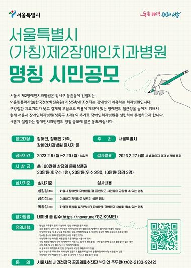 서울시가 오세훈 시장의 핵심 철학인 ‘약자와의 동행’의 일환으로 공공의료 인프라를 확충하기 위해 두 번째 건립하는 ‘장애인치과병원’의 새로운 이름을 공모한다.