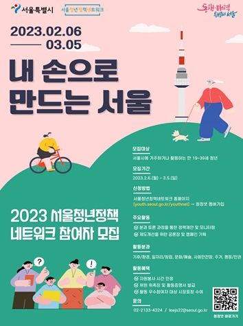 [제주교통복지신문 김강석 기자] 서울시는 서울청년정책네트워크에서 활동할 청년들을 2월 6일부터 3월 5일까지 모집한다고 밝혔다. 청정넷 참여자들은 분과별 활동을 통해 청년자율예산 편성을 위한 정책제안 및 토론, 캠페인 활동 등 다양한 사회문제 해결을 위해 활동한다.