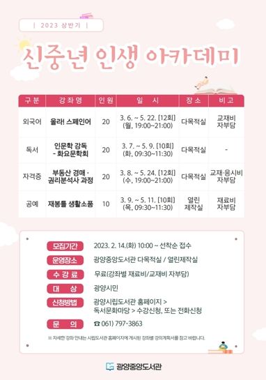 [제주교통복지신문 김강석 기자] 광양중앙도서관은 오는 14일부터 상반기'신중년 인생 아카데미'프로그램 수강생을 모집한다고 6일 밝혔다.