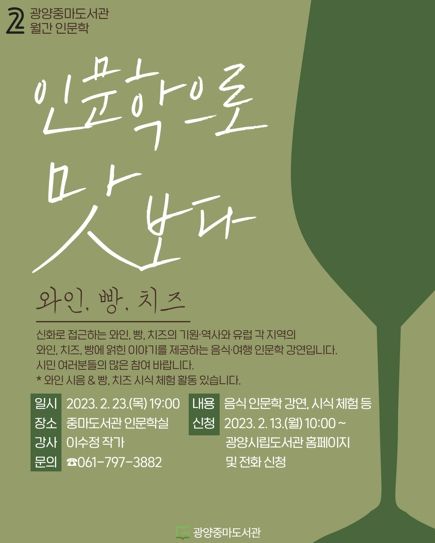 [제주교통복지신문 김강석 기자] 광양중마도서관은 오는 23일 오후 7시, 중마도서관 인문학실에서 ‘2023 중마도서관 월간 인문학’ 제1차 강연 ‘인문학으로 맛보다’ 특강을 개최한다.