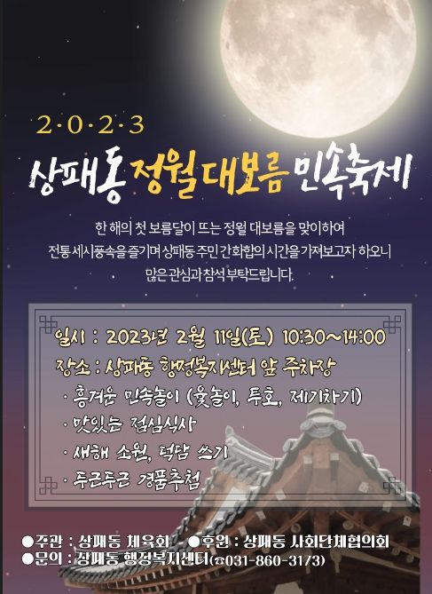 또한 상패동장은 “코로나19 등 오랜 악재를 지나 5년만에 열리는 정월대보름 민속축제인 만큼 상패동 동민뿐 아니라 많은 분들께서 참여하시어 즐거운 하루를 보내시기를 바라며, 2023년 모든 주민에게 행복과 번영이 가득하시기를 바란다”라고 밝혔다.