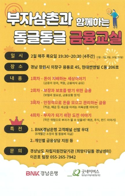 이번 교육은'부자삼촌과 함께하는 동글동글 금융교실'이라는 제목으로 경상남도 자립지원전담기관에서 2월 2일부터 한 달간 매주 목요일 주 1회씩 총 4회에 걸쳐 진행된다.