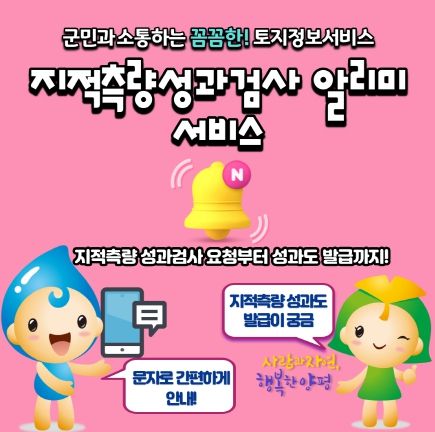 이번에 시행되는 알리미 서비스는 이러한 불편사항들을 해결하기 위한 것으로, 양평군 민원토지과는 지적측량 접수 시 알리미 서비스에 대한 신청 동의를 받아 지적측량 검사요청, 검사완료 등 과정과 내용이 담긴 안내문자를 발송하여 측량과정 및 일정에 대한 궁금증을 해소하고자 한다.
