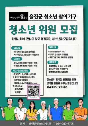 모집 대상은 12~24세의 관내 청소년 또는 관내 학교에 재학 중인 청소년이며, 위원으로 선발되면 울진군수 명의 위촉장 수여, 자원봉사 확인서 발급, 다양한 청소년 행사 및 프로그램에 참여 기회 제공 등의 혜택이 주어진다.