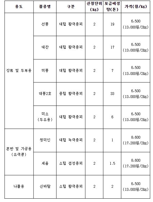 종자 신청은 2월 22일까지 각 시군농업기술센터로 하면 된다. 2kg당 장류·두부용, 콩나물용 콩은 1만 3,000원, 혼반 및 가공용 콩(유색콩)은 1만 7,200원에 판매한다.