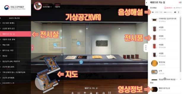 이번에 새롭게 선보이는 온라인 박물관은 실제 국립고궁박물관에서 운영 중인 7개 상설 전시실(조선의 국왕실, 조선의 궁궐실, 왕실의 생활실, 대한제국실, 궁중 서화실, 왕실 의례실, 과학문화실)을 다양한 각도에서 촬영하여 가상현실(VR)로 재현했으며, 소장 유물들을 사진(JPG), 음성 해설(MP3), 동영상(MP4), 전시정보(PDF) 등 다양한 콘텐츠로 감상할 수 있게 했다. 또한 전시된 소장품의 고화질 사진 자료는 ‘다운로드’ 기능을 통해 누구나 쉽게 내려 받을 수 있으며, 음성 해설 파일에는 국문 자막이 함께 제공된다.